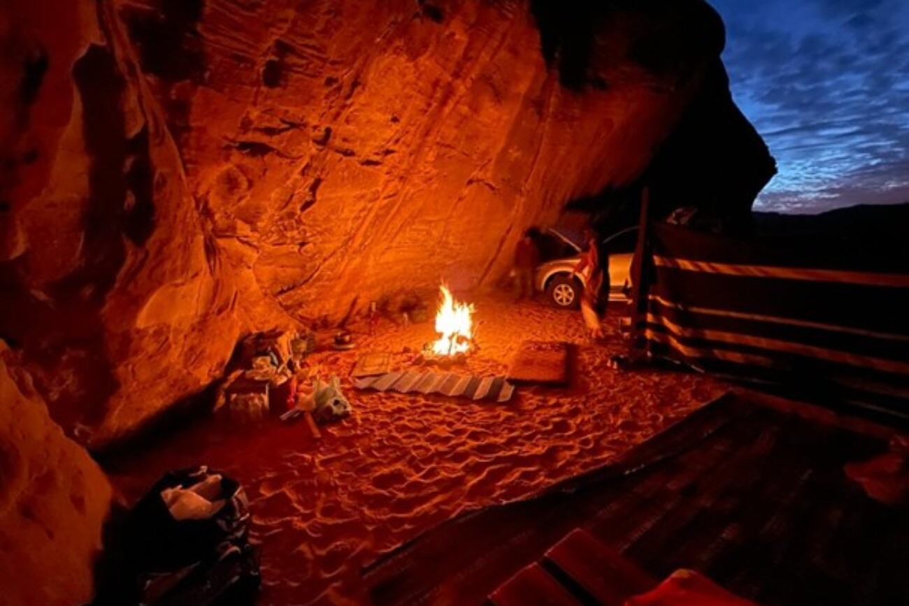 During the day you will join our 7 hours jeep guided tour before going to a bivouac place in the desert. Sleeping under stars means that you will sleep out in the desert in the nature under a cliff. No building. No noise. It will be just the guide and you. We provide mattresses, pillows, blankets, water and even a tent if you don’t want to sleep out in the open. Your guide will cook a local bedouin dinner and bedouin tea over a hot wood fire right before your eyes.